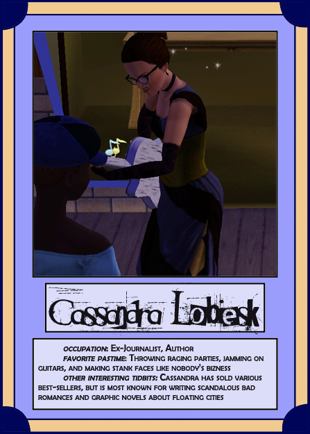 Lobiesk Household - At first, Cassandra Lobiesk had been quite content living a bachelorette life in her quaint little house. However, after her success as an editor-in-chief and a promising author, it had occurred to Cassie that it was time to set her sights on larger accommodations. That was when she bought a new home, a bigger one, and quit her job to become a full-time writer. Only, she couldn't exactly pay for all that room. So she invited Ryan Lobiesk in with her. As a businessman, Ryan would be providing the funds within the household. Not to mention the raging parties.